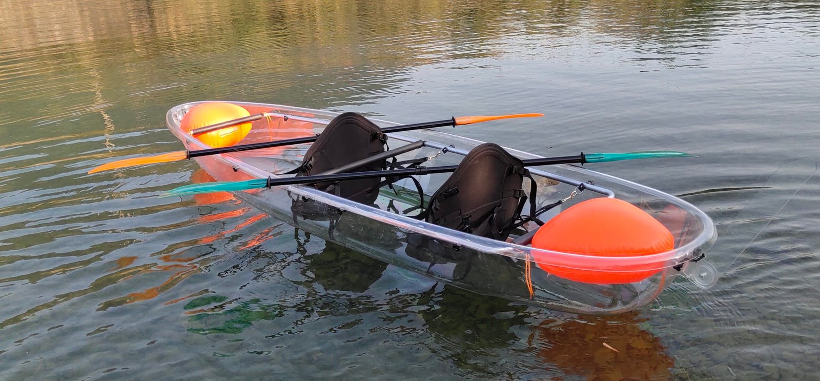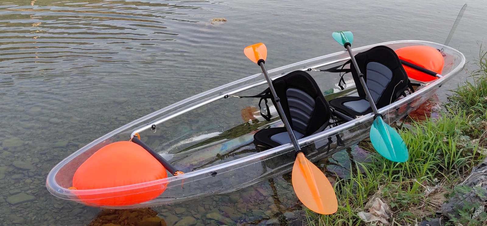 This is a double transparent kayak with 340cm length, the PC material is very transparent and suitable for clear waters. You can see fish swimming under the kayak, and the plants underwater are clearly visible. It is suitable for taking photos and checking in for tourists with your friend and your children.